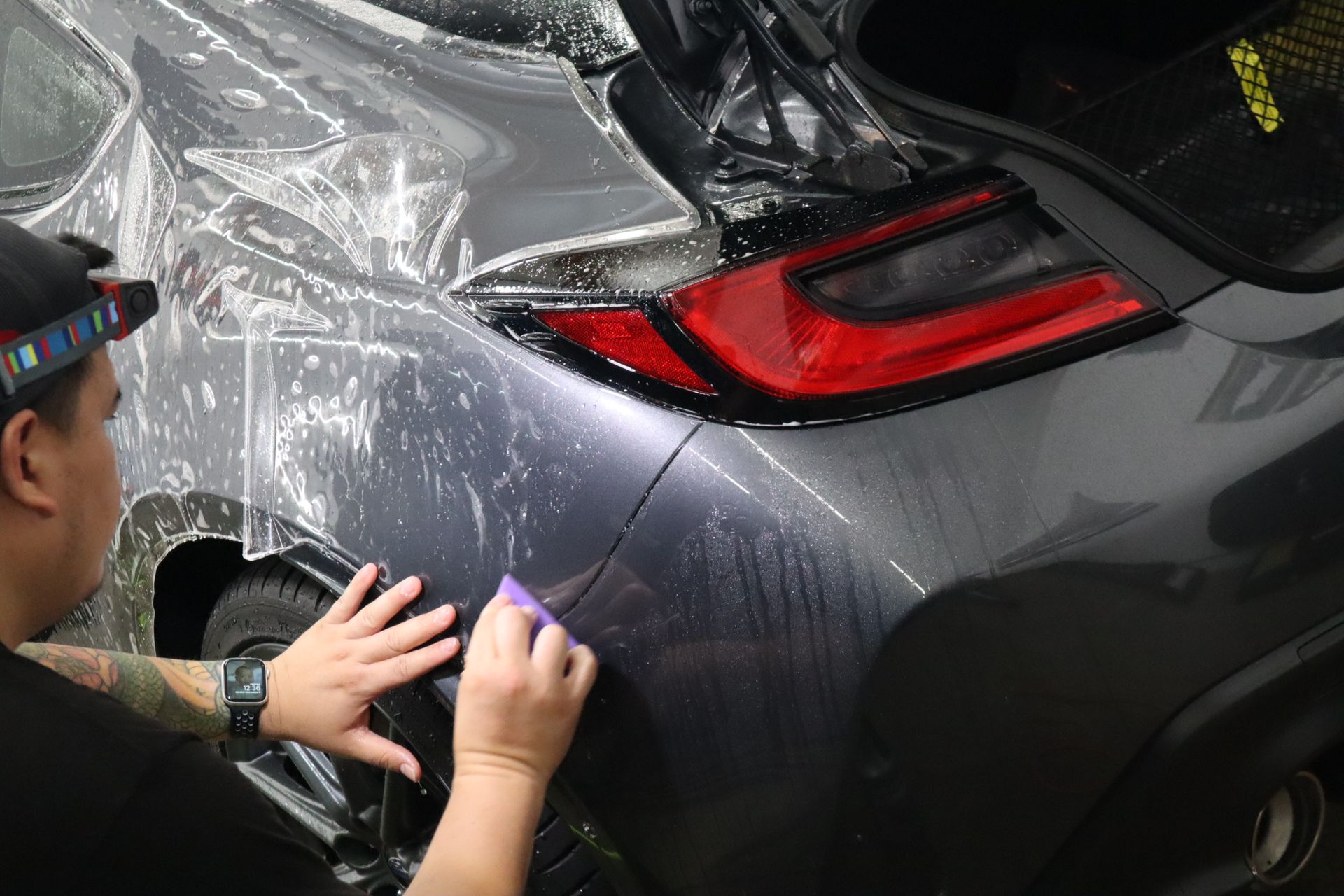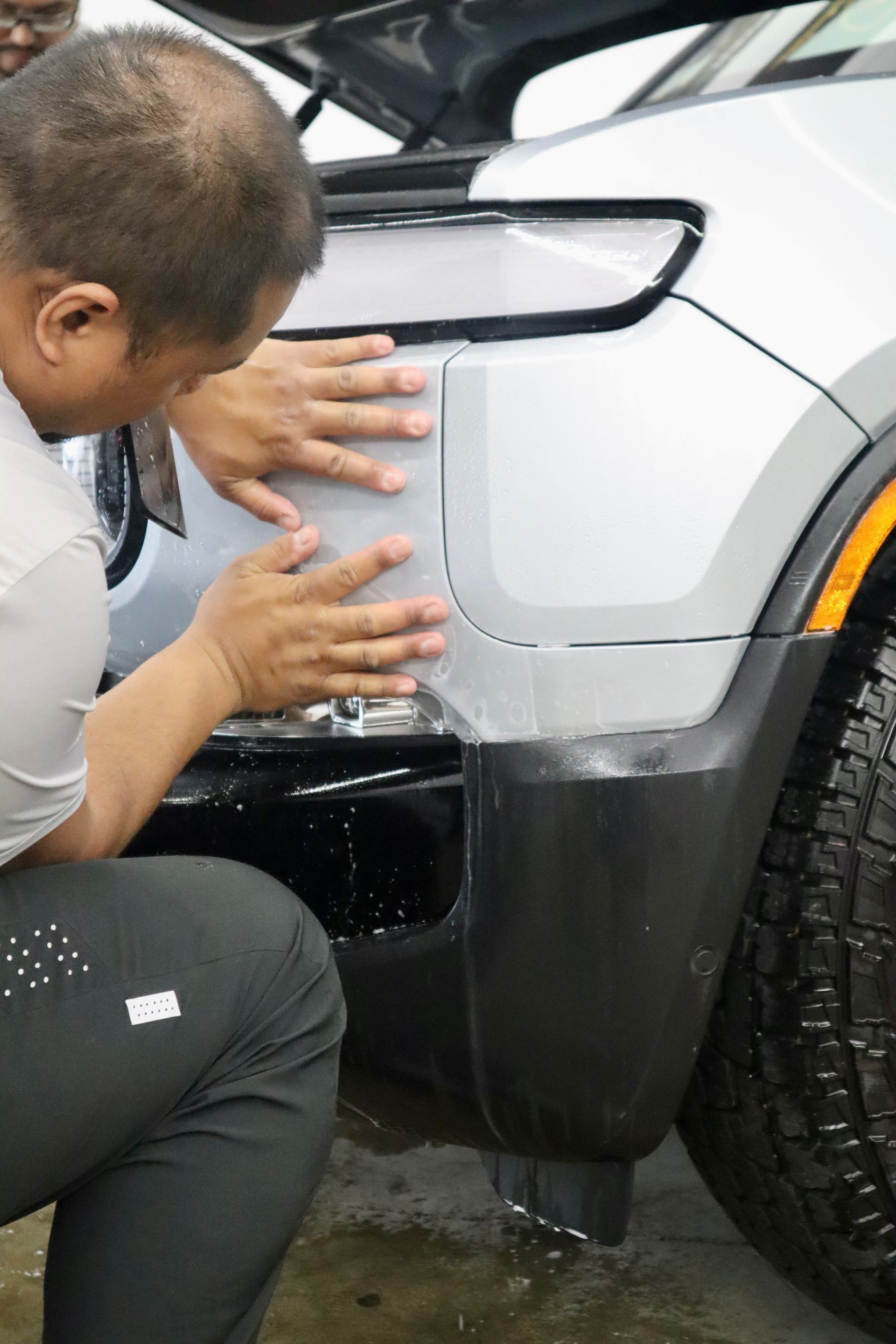 Custom shapes are cut from the film that fit the make and model of your vehicle at the time of your appointment. To install these pieces, we make a mixture of water and a special application solution that gets applied to both the vehicle's surface and the adhesive side of your PPF. This allows us to easily position and adjust the film during the hand application process. The cut PPF pieces are carefully positioned and applied to the vehicle's surface, starting from one end and gradually working to the other. Our trained staff at Prestige Pro Care will use squeegees and other tools to remove air bubbles and ensure a smooth and even application.